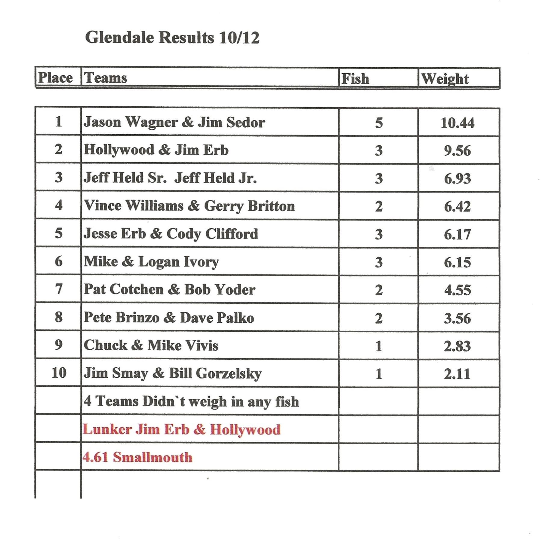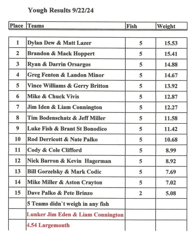 2024 Buddy Tournament Results updated 10/13 1st Jason Wagner & Jim Sedor 10.44 2nd Jim Erb & Hollywood, Pupwood 9.56 And Lunker 6.61 Smallmouth 3rd Jeff Held Sr & Jr 6.93 Hollywood & Jim Erb Lunker Smallmouth Top 4 Teams Share this: Click to share on X (Opens in new window) X Click to share on Facebook (Opens in new window) Facebook Click to share on Reddit (Opens in new window) Reddit Click to share on LinkedIn (Opens in new window) LinkedIn Like Loading...